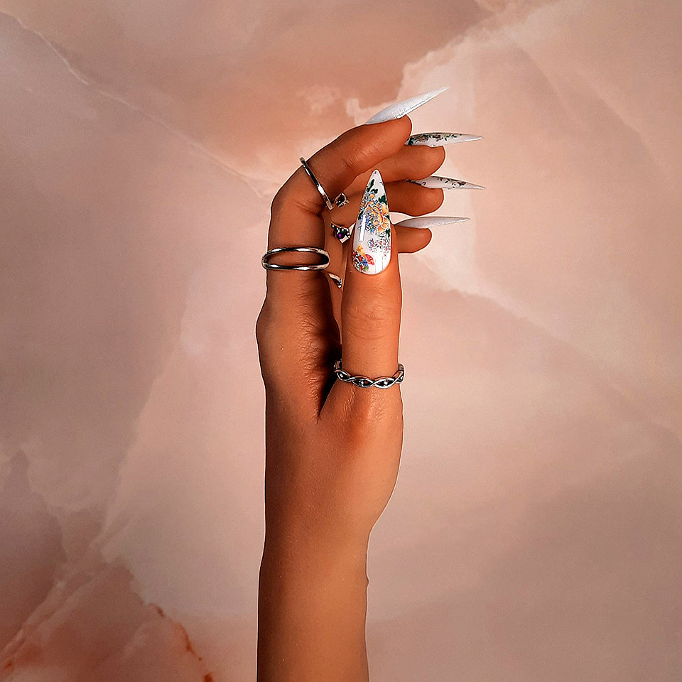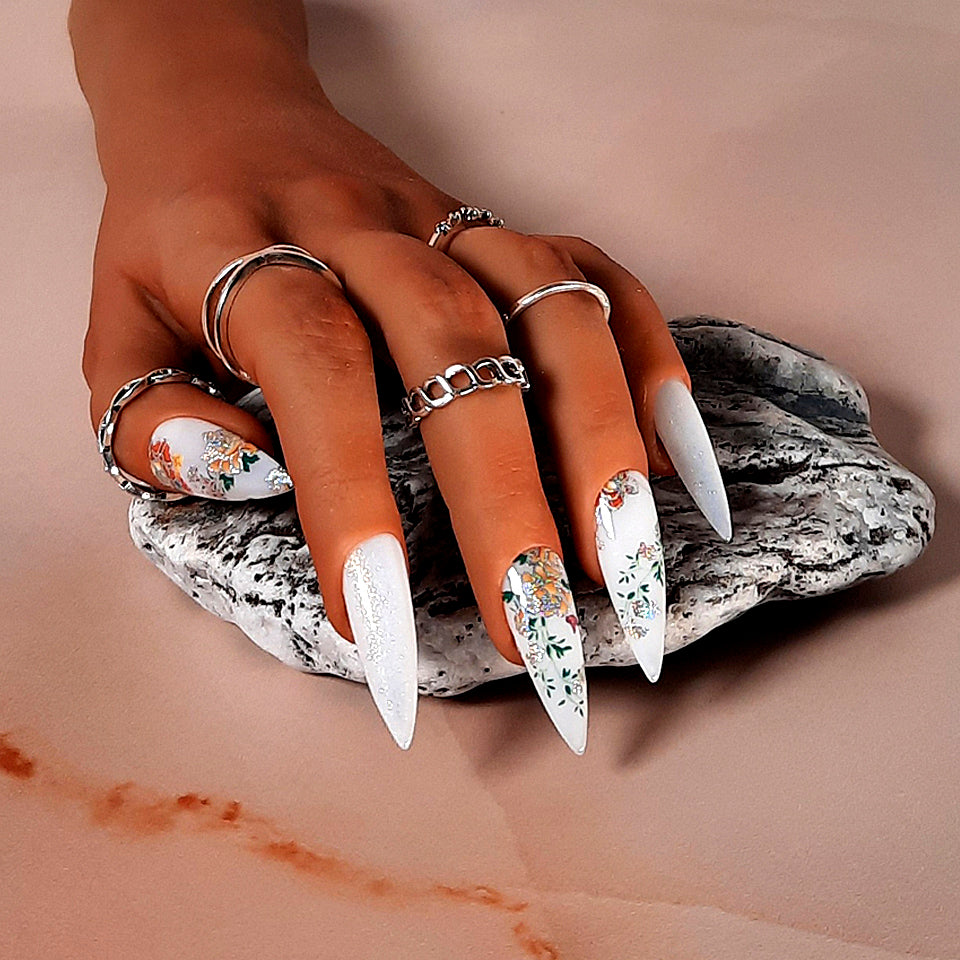 A beautiful set of press on nails with oriental vibes. Milky white and sparkly white gel polish with a very pretty flower and butterfly holo foil. Finished with a glossy top coat.