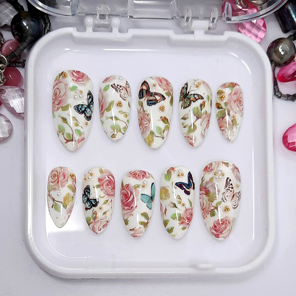 White Press On Nails with Roses & Butterflies