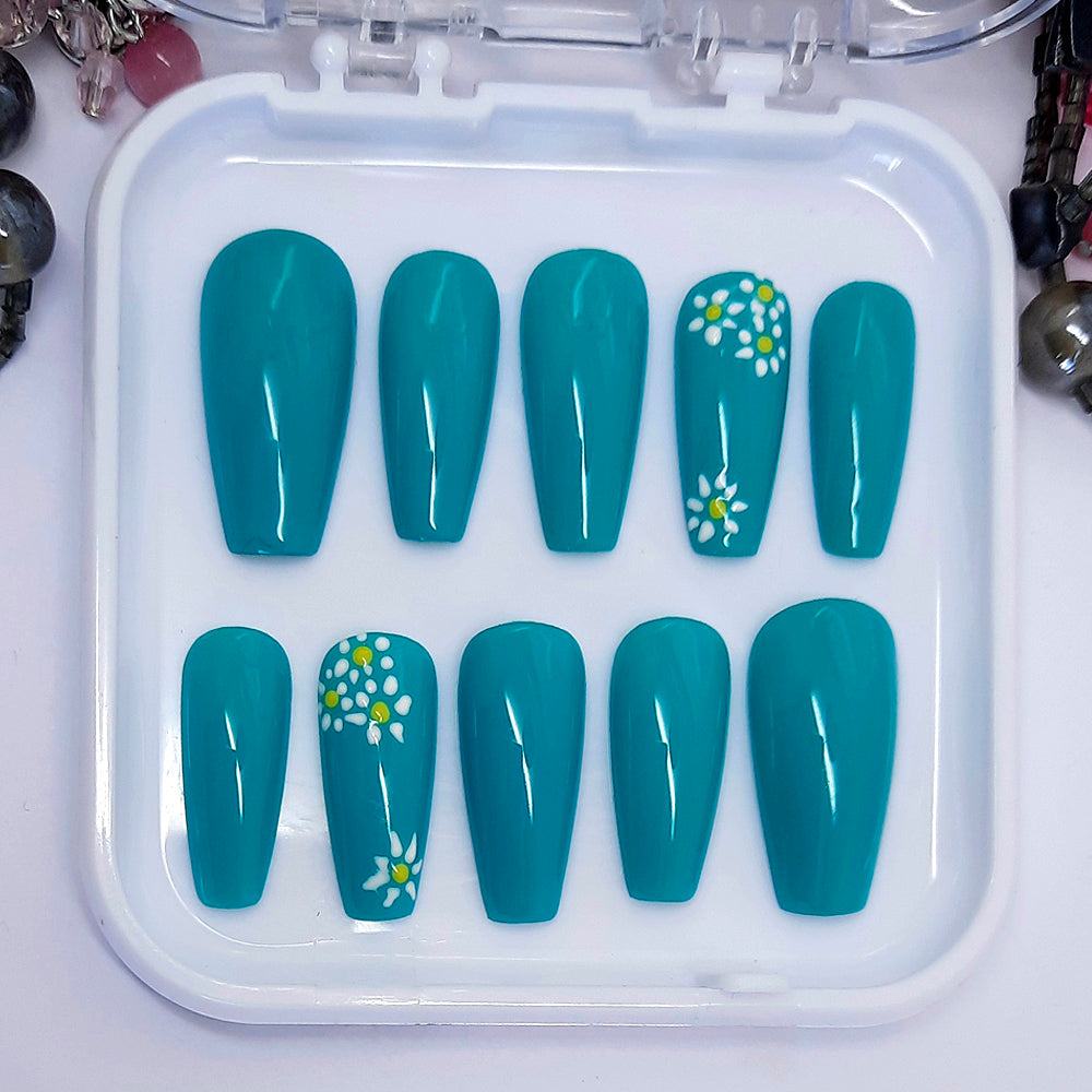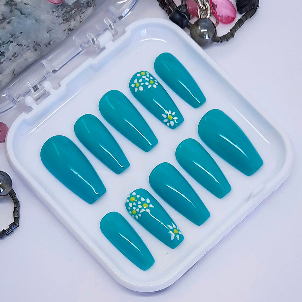 Beautiful blue press on nails with hand painted flowers accent. Finished with a glossy top coat.