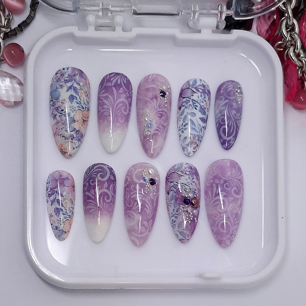 Sweet and pretty press on nails in lilac and white, with flowers and leaves, white swirls, and some 3d nail art. Finished in gloss top coat.