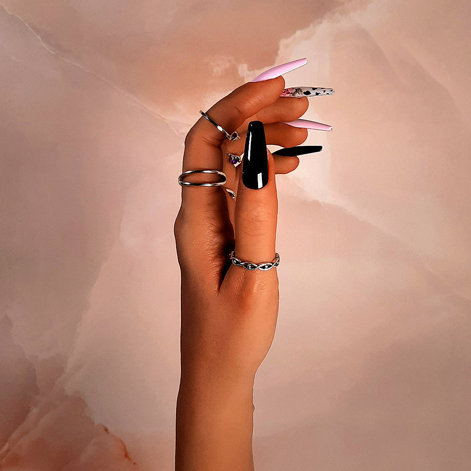 Beautiful soft pink and black press on nails with animal print and rose accent. Finished with a glossy top coat.