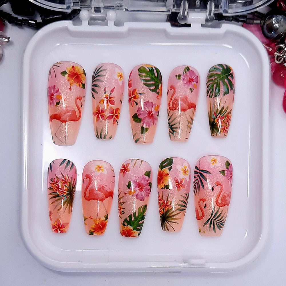 Very beautiful shimmering semi-sheer press on nails in soft orange and pink decorated with tropical flowers, leaves, and flamingos. Finished in gloss top coat.