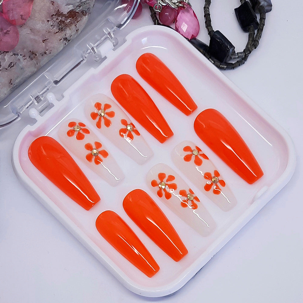 Stunning orange and white press on nails with hand painted flowers and gold studs in the centres. Finished with a glossy top coat.