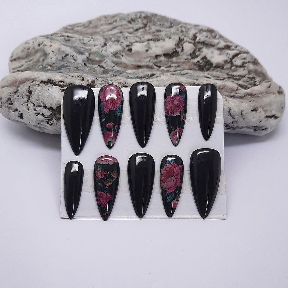 A beautiful set of press on nails. Black gel with pink roses, finished with a glossy top coat.