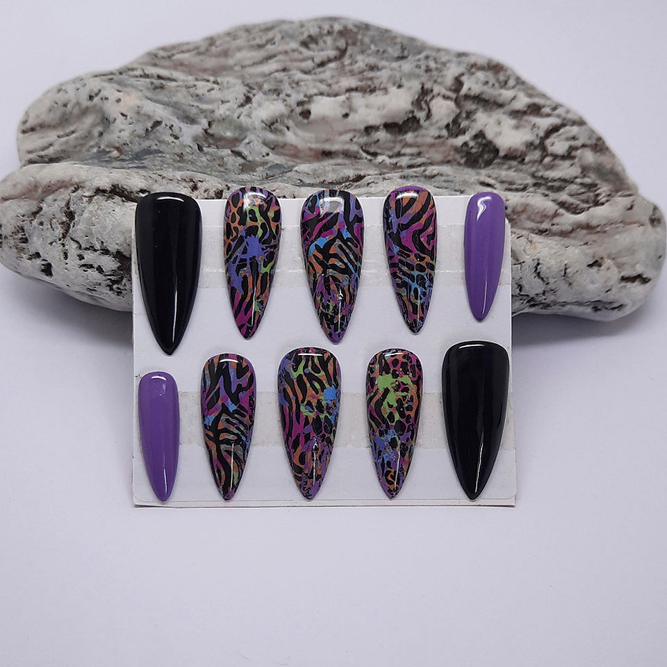 A beautiful set of press on nails. Black and lilac with an abstract animal print design, finished with a glossy top coat.