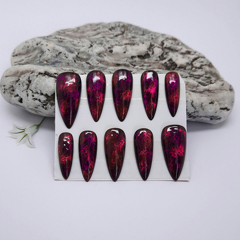 Stunning black press on nails with a pink swirly design, finished with a glossy top coat.