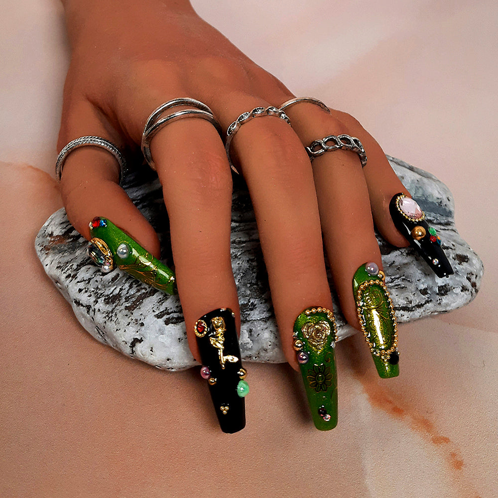 These are seriously eye-catching press on nails. In black and green gel polish, with gold stickers, chains, crystals, charms, pearls and caviar beads.